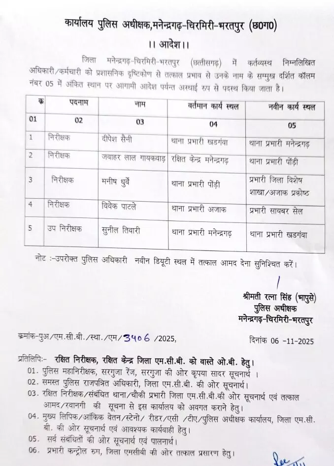 मनेंद्रगढ़-चिरमिरी-भरतपुर। एमसीबी जिले की पुलिस में फेरबदल हुआ है। एसपी रत्ना सिंह ने कई थानों के प्रभारियों को बदल दिया है। जारी आदेश के मुताबिक निरीक्षक दीपेश सैनी को खडगंवा से मनेन्द्रगढ़ थाना का प्रभारी बनाया गया हैं। निरीक्षक जवाहर लाल गायकवाड़ को रक्षित केंद्र मनेन्द्रगढ़ से पोंडी प्रभारी, निरीक्षक मनीष धुर्वे को थाना प्रभारी पोंड़ी से प्रभारी जिला विशेष शाखा अजाक प्रकोष्ठ, निरीक्षक विवेक पाटले को प्रभारी अजाक से प्रभारी सायबर सेल तथा उप निरीक्षक सुनील तिवारी को थाना प्रभारी मनेन्द्रगढ़ से थाना प्रभारी खडगंवा भेजा गया है।
